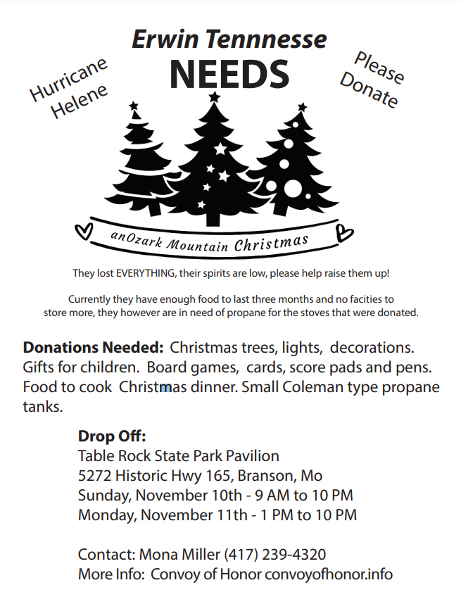 During the 2024 Convoy of Honor, patriots from across the country came together to collect donations for a special mission — bringing an Ozark Mountain Christmas to Erwin, Tennessee, a community deeply affected by Hurricane Helene.