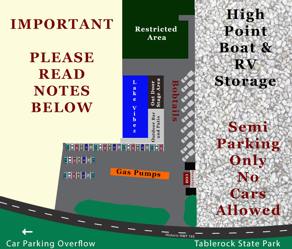 We’ve got parking covered for everyone — big rigs, cars, and RVs! Please read the notes below the map for complete details.